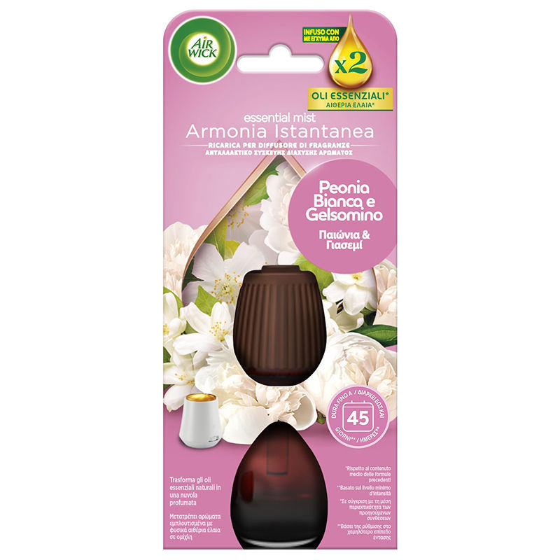 Το ανταλλακτικό της εταιρείας Airwick έχει εξαιρετικό άρωμα παιώνιας και γιασεμιού με ελαφριές νότες κίτρου. Τοποθετήστε το ανταλλακτικό στην ειδική συσκευή Essential Mist της Airwick και επιλέξτε μια από 3 ρυθμίσεις έντασης. Δημιουργήστε δροσερή και γαλήνια ατμόσφαιρα με τη βοήθεια της παιώνιας που ενώνεται αρμονικά με το λευκό γιασεμί.