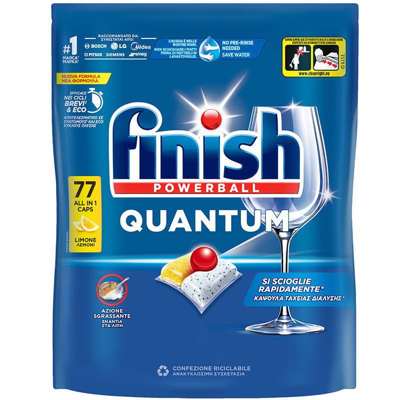 Η Finish Quantum All in 1 προσφέρει βαθιά καθαριότητα και αστραφτερή λάμψη από την 1η φορά και κάθε φορά. Η συμπυκνωμένη σύνθεση 3 θαλάμων είναι αποτελεσματική στο να απομακρύνει όλα τα είδη υπολειμμάτων φαγητού ακόμα και χωρίς ξέβγαλμα.