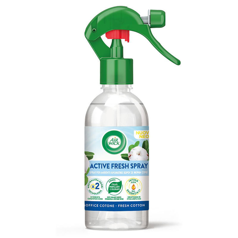 Το Air Wick Active Fresh Spray Fresh Cotton 237ml είναι ένα premium αρωματικό χώρου από φυσικά αιθέρια έλαια που εξουδετερώνει αποτελεσματικά τις δυσάρεστες οσμές. Με οικολογική σύνθεση χωρίς προωθητικά, χρωστικές και φθαλικές ενώσεις, προσφέρει διαρκές και φρέσκο άρωμα στο χώρο σας. Το μπουκάλι είναι κατασκευασμένο από 100% ανακυκλωμένο πλαστικό και διαθέτει την καινοτόμο x2 τεχνολογία εξουδετέρωσης οσμών για καθαρή ατμόσφαιρα. Ιδανικό για όλους τους χώρους του σπιτιού, γραφεία και επαγγελματικούς χώρους που χρειάζονται αναζωογόνηση."