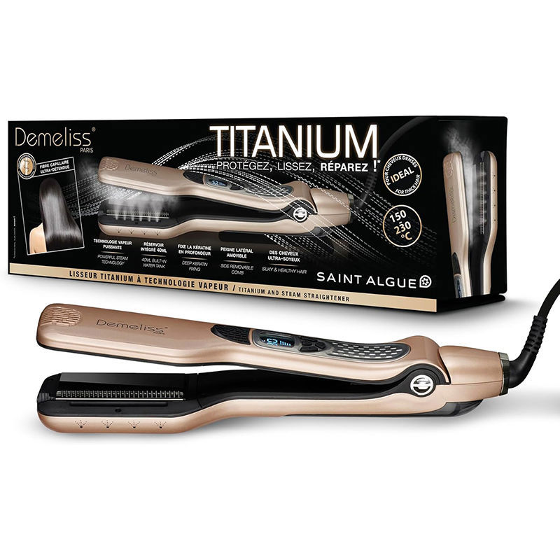 Η DEMELISS Titanium είναι μια ψηφιακή πρέσα ατμού 250W με φαρδιές πλάκες τιτανίου και σύστημα γρήγορης θέρμανσης που φτάνει τους 230°C σε μόλις 45 δευτερόλεπτα. Κατάλληλη για όλους τους τύπους μαλλιών, τιθασεύει ακόμα και τις πιο δύσκολες τρίχες με λιγότερα περάσματα — εγγυώμενη λαμπερό αποτέλεσμα και ολοκληρωμένη προστασία.