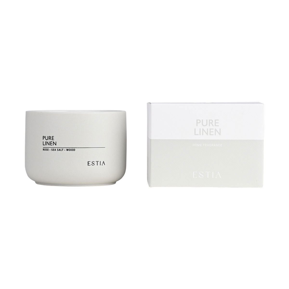 Το αρωματικό κερί Estia Pure Linen με βάρος 280g αναπαράγει την αίσθηση των φρεσκοπλυμένων λευκών πετσετών που στεγνώνουν στον ήλιο με το απαλό αεράκι. Ένα καθαρό, αέρινο άρωμα που συνδυάζει φλοράλ νότες με την δροσιά του θαλασσινού αλατιού και τη ζεστασιά του ξύλου, δημιουργώντας μια ατμόσφαιρα απόλυτης καθαρότητας και γαλήνης.