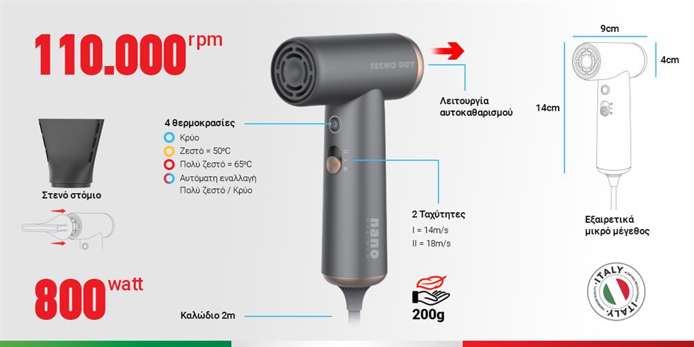 - 🚀 110.000 στροφές/λεπτό για εκπληκτική ταχύτητα στεγνώματος